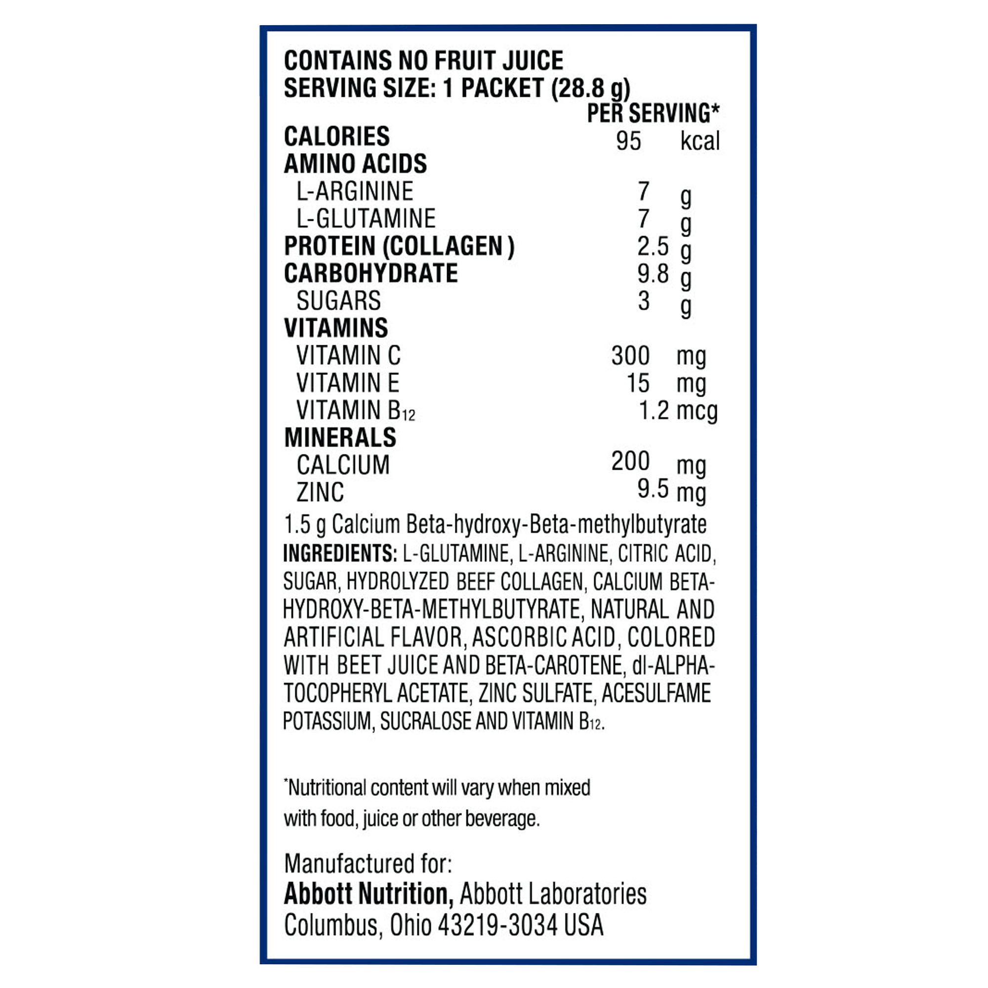 | Ingredients | L-Glutamine, L-Arginine, Citric Acid, Sugar, Hydrolyzed Beef Collagen, Calcium Beta-Hydroxy-Beta-Methylbutyrate, Natural & Artificial Flavor, Ascorbic Acid, Colored with Beet Juice and Beta-Carotene, dl-Alpha-Tocopheryl Acetate, Zinc Sulfate, Acesulfame Potassium, Sucralose, and Vitamin B12 |