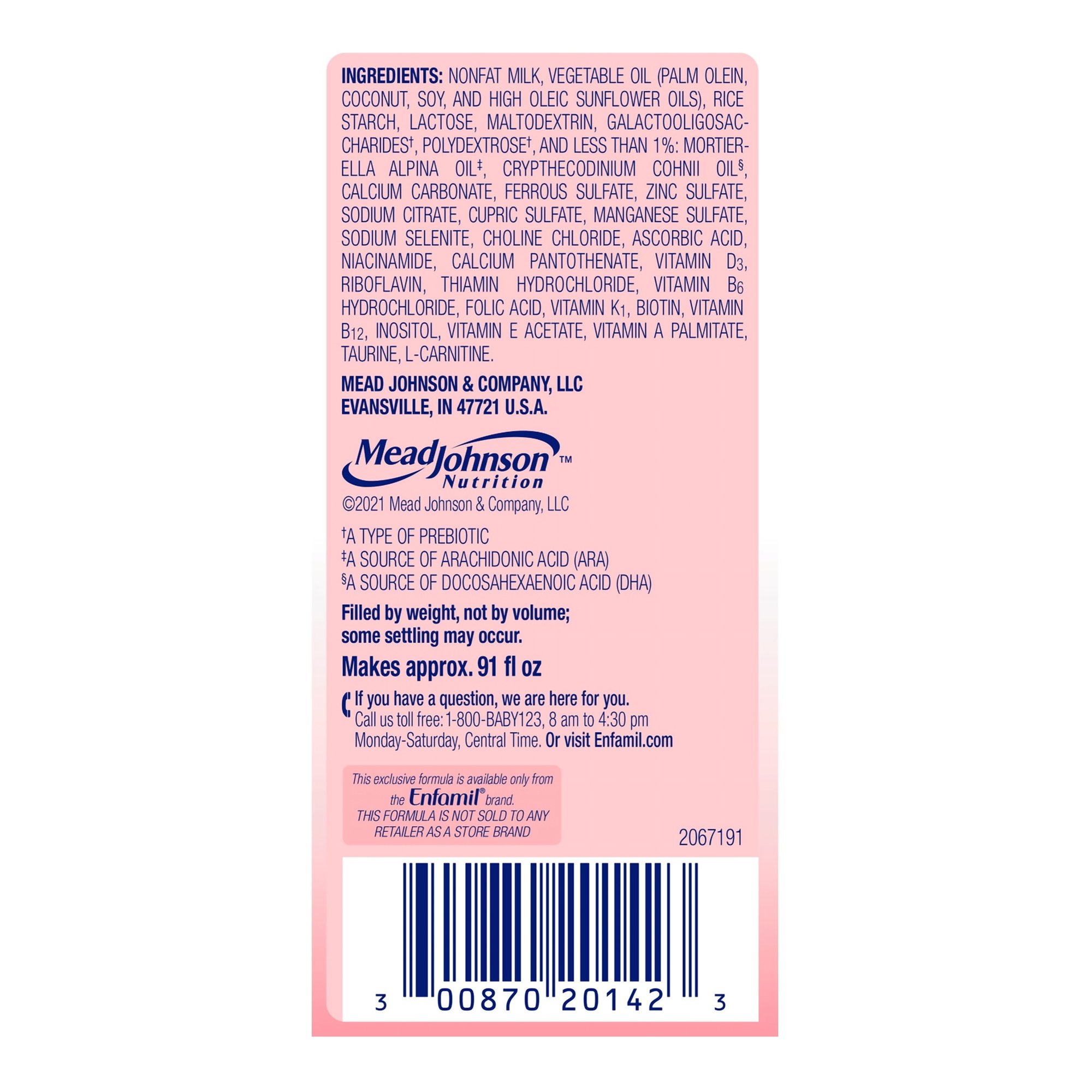 | Ingredients | NONFAT MILK, VEGETABLE OIL (PALM OLEIN, COCONUT, SOY, AND HIGH OLEIC SUNFLOWER OILS), RICE STARCH, LACTOSE, MALTODEXTRIN, GALACTOOLIGOSACCHARIDES, POLYDEXTROSE, AND LESS THAN 1%: MORTIERELLA ALPINA OIL, CRYPTHECODINIUM COHNII OIL, CALCIUM CARBONATE, FERROUS SULFATE, ZINC SULFATE, SODIUM CITRATE, CUPRIC SULFATE, MANGANESE SULFATE, SODIUM SELENITE, CHOLINE CHLORIDE, ASCORBIC ACID, NIACINAMIDE, CALCIUM PANTOTHENATE, VITAMIN D3, RIBOFLAVIN, THIAMIN HYDROCHLORIDE, VITAMIN B6 HYDROCHLORIDE, FOLIC ACID, VITAMIN K1, BIOTIN, VITAMIN B12, INOSITOL, VITAMIN E ACETATE, VITAMIN A PALMITATE, TAURINE, L-CARNITINE |