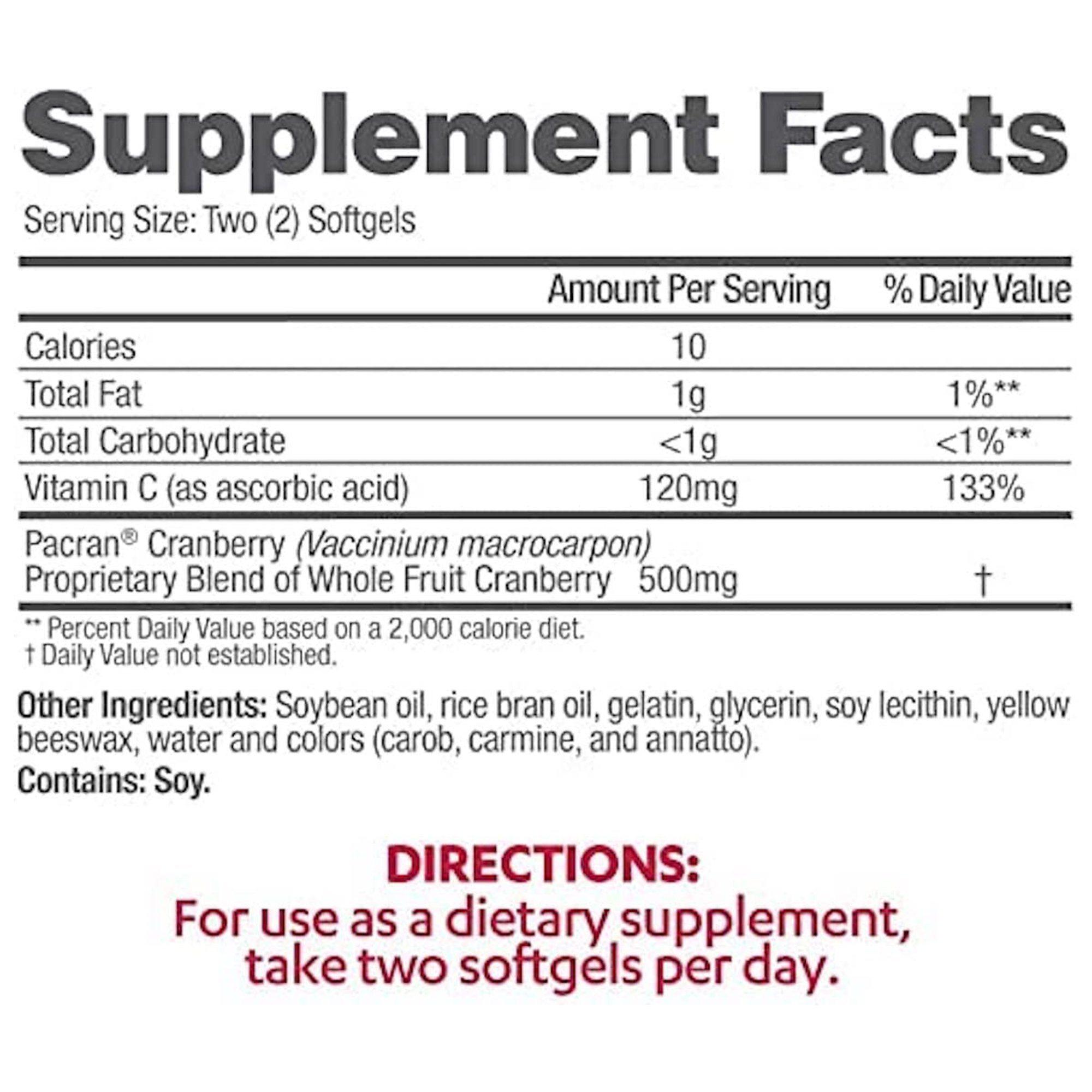 | Active Ingredients | Vitamin C (as ascorbic acid) / Cranberry (Vaccinium macrocarpon) Whole Fruit Powder |