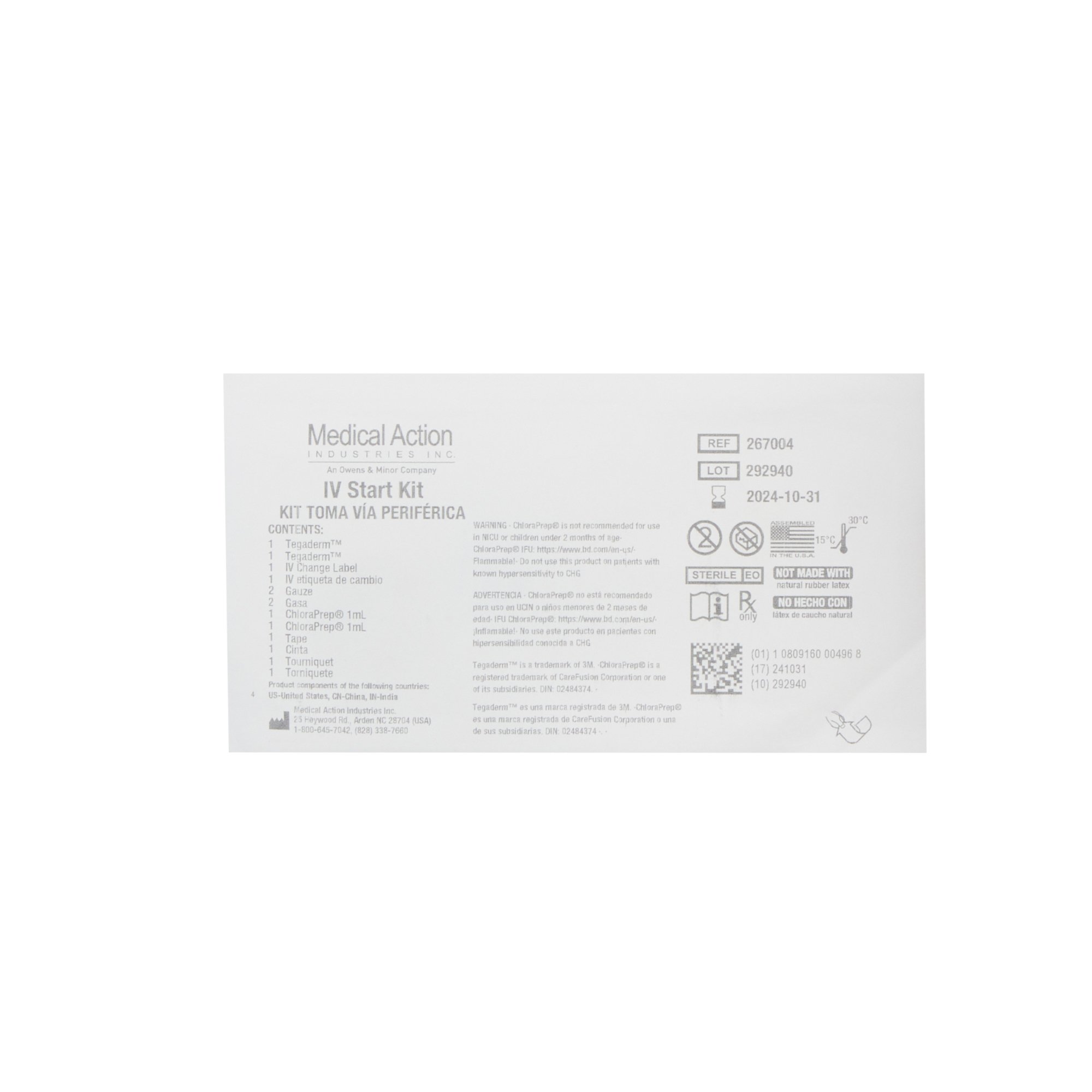 | Contents | (1) ChloraPrep® Antiseptic .67mL SEPP® Applicator (1) Tegaderm® Transparent Dressing 2.375 X 2.75 inch (2) Gauze Sponges 2 X 2 inch / (1) 75 X 24 inch Transpore™ Tape (1) Tourniquet (1) Venipuncture Information Label |
