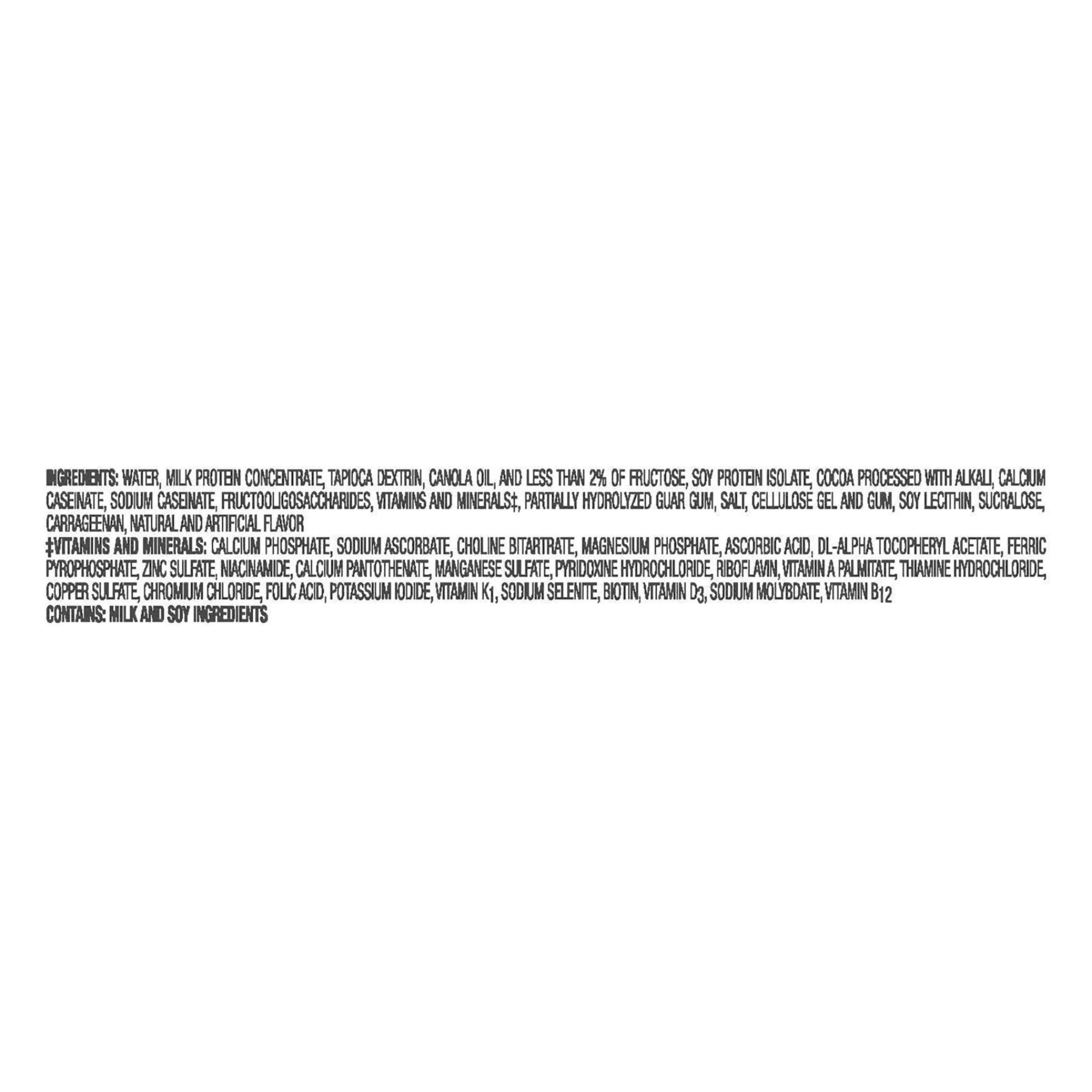 | Ingredients | Water, Milk Protein Concentrate, Tapioca Dextrin, Canola Oil, And Less Than 2% Offructose, Soy Protein Isolate, Calcium Caseinate, Sodium Caseinate, Cocoa Processed With Alkali, Inulin (From Chicory), Vitamins And Minerals*,Partially Hydrolyzed Guar Gum, Salt, Cellulose Gel And Gum, Soy Lecithin, Sucralose, Carrageenan, Natural And Artificial Flavor *Vitamins And Minerals: Calcium Phosphate, Sodium Ascorbate, Choline Bitartrate, Magnesium Phosphate, Ascorbic Acid, Dl-Alpha Tocopheryl Acetate, Ferric Pyrophosphate, Zinc Sulfate, Niacinamide, Calcium Pantothenate, Manganese Sulfate, Pyridoxine Hydrochloride, Riboflavin, Vitamin A Palmitate, Thiamine Hydrochloride, Copper Sulfate, Chromium Chloride, Folic Acid, Potassium Iodide, Vitamin K1, Sodium Selenite, Biotin, Vitamin D3, Sodium Molybdate, Vitamin B12 |