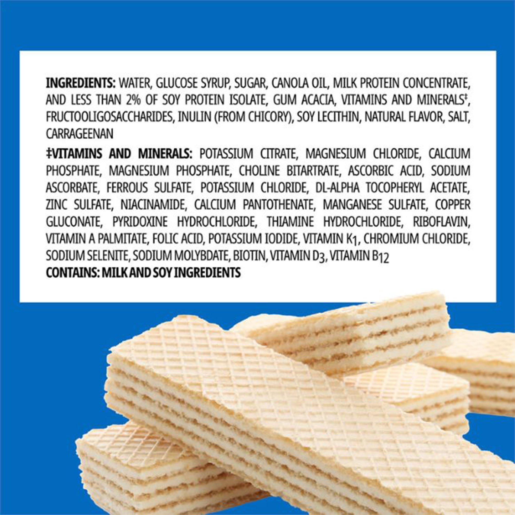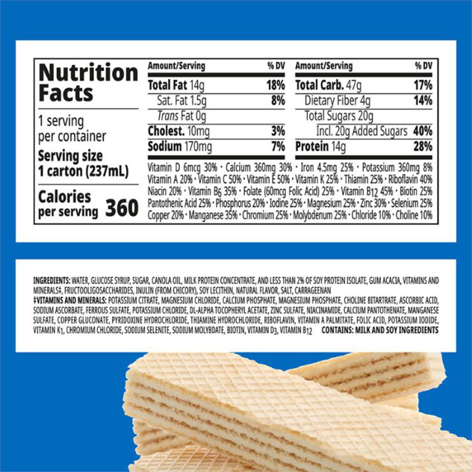 | Ingredients | WATER, GLUCOSE SYRUP, SUGAR, VEGETABLE OIL (CANOLA, HIGH OLEIC SUNFLOWER, CORN), MILK PROTEIN CONCENTRATE, AND LESS THAN 2% OF COCOA PROCESSED WITH ALKALI, SOY PROTEIN ISOLATE, CALCIUM CASEINATE, SODIUM CASEINATE, VITAMINS AND MINERALS‡, GUM ACACIA, FRUCTOOLIGOSACCHARIDES, INULIN (FROM CHICORY), SOY LECITHIN, SALT, CARRAGEENAN, NATURAL AND ARTIFICIAL FLAVOR, POTASSIUM CITRATE, CALCIUM PHOSPHATE, MAGNESIUM CHLORIDE, MAGNESIUM PHOSPHATE, SODIUM ASCORBATE, CHOLINE BITARTRATE, POTASSIUM CHLORIDE, FERRIC PYROPHOSPHATE, DL-ALPHA TOCOPHERYL ACETATE, ZINC SULFATE, NIACINAMIDE, CALCIUM PANTOTHENATE, MANGANESE SULFATE, PYRIDOXINE HYDROCHLORIDE, RIBOFLAVIN, THIAMINE HYDROCHLORIDE, VITAMIN A PALMITATE, COPPER SULFATE, FOLIC ACID, POTASSIUM IODIDE, VITAMIN K1, CHROMIUM CHLORIDE, SODIUM SELENITE, BIOTIN, SODIUM MOLYBDATE, VITAMIN D3, VITAMIN B12 |