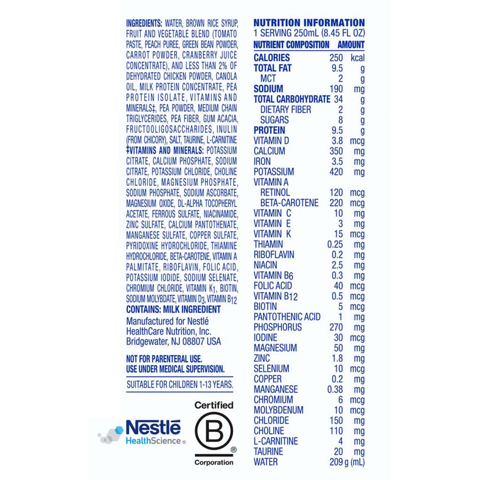 | Ingredients | WATER, BROWN RICE SYRUP, FRUIT AND VEGETABLE BLEND (TOMATO PASTE, PEACH PUREE, GREEN BEAN POWDER, CARROT POWDER, CRANBERRY JUICE CONCENTRATE), AND LESS THAN 2% OF DEHYDRATED CHICKEN POWDER, CANOLA OIL, MILK PROTEIN CONCENTRATE, PEA PROTEIN ISOLATE, VITAMINS AND MINERALS, PEA POWDER, MEDIUM CHAIN TRIGLYCERIDES, PEA FIBER, GUM ACACIA, FRUCTOOLIGOSACCHARIDES, INULIN (FROM CHICORY), SALT, TAURINE, L-CARNITINE, VITAMINS AND MINERALS: POTASSIUM CITRATE, CALCIUM PHOSPHATE, SODIUM CITRATE, POTASSIUM CHLORIDE, CHOLINE CHLORIDE, MAGNESIUM PHOSPHATE, SODIUM PHOSPHATE, SODIUM ASCORBATE, MAGNESIUM OXIDE, DL-ALPHA TOCOPHERYL ACETATE, FERROUS SULFATE, NIACINAMIDE, ZINC SULFATE, CALCIUM PANTOTHENATE, MANGANESE SULFATE, COPPER SULFATE, PYRIDOXINE HYDROCHLORIDE, THIAMINE HYDROCHLORIDE, BETA-CAROTENE, VITAMIN A PALMITATE, RIBOFLAVIN, FOLIC ACID, POTASSIUM IODIDE, SODIUM SELENATE, CHROMIUM CHLORIDE, VITAMIN K1, BIOTIN, SODIUM MOLYBDATE, VITAMIN D3, VITAMIN B12 |