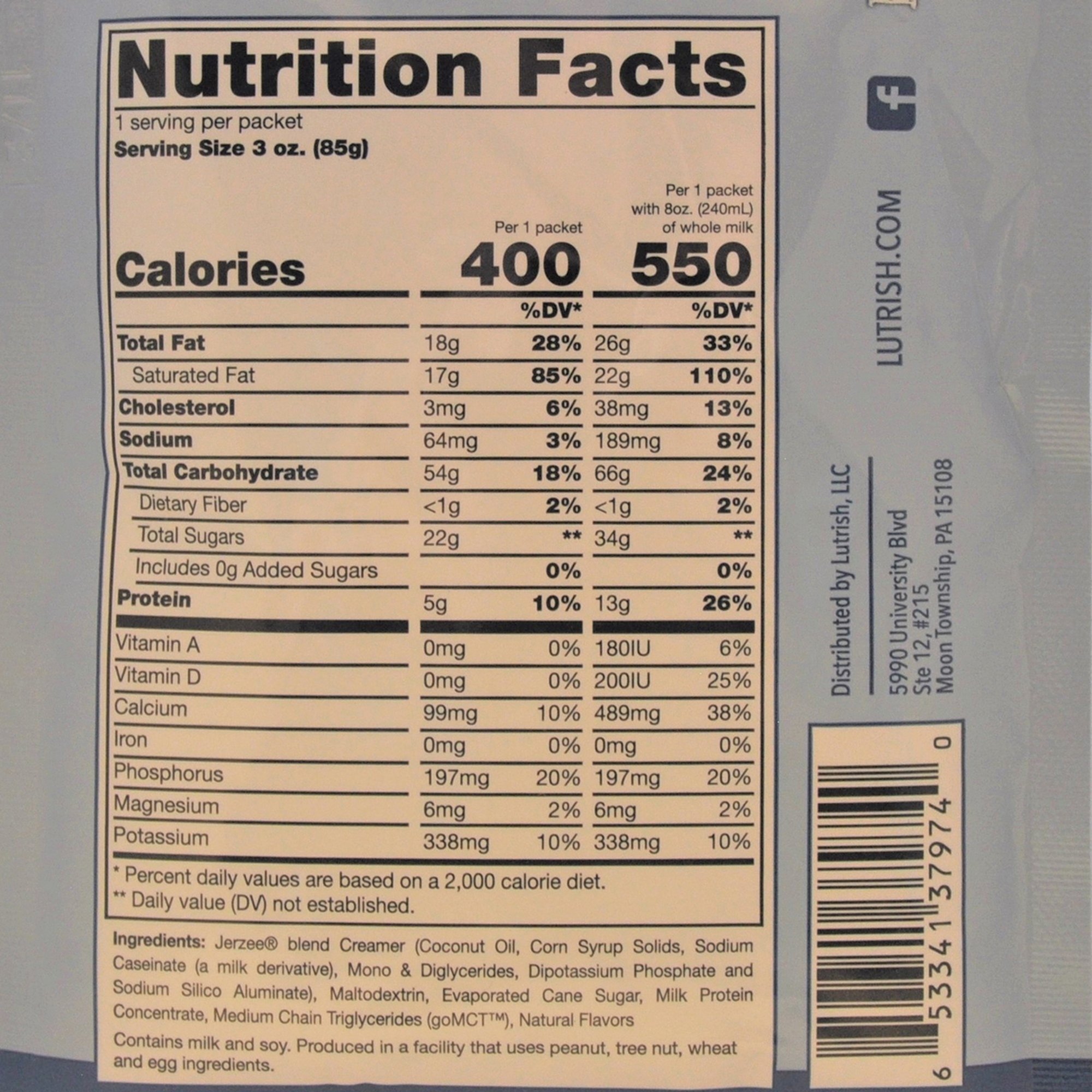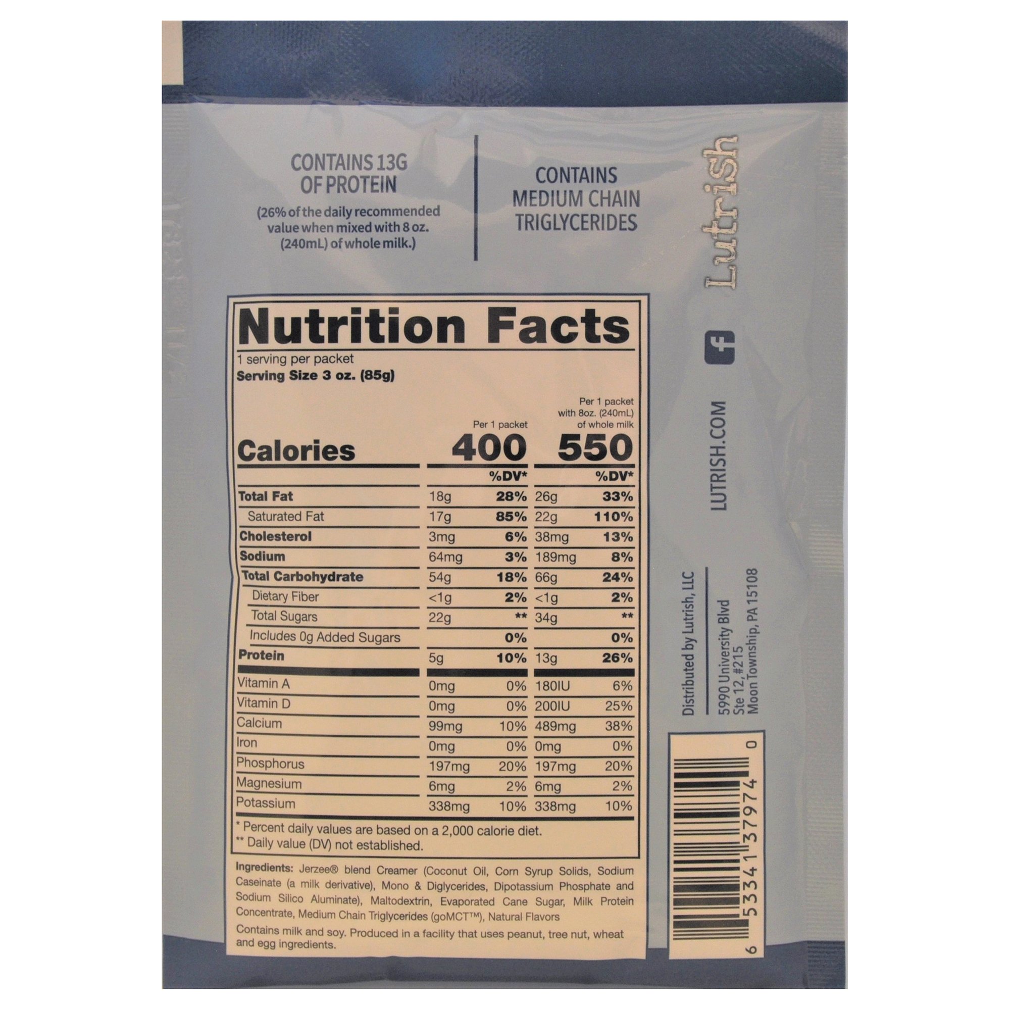 | Ingredients | Coconut Oil Blend ( Coconut Oil, Corn Syrup Solids, Sodium Caseinate (a Milk Deriviative), Mono and Diglycerides, Dipotassium Phosphate and Sodium Silico Aluminate, Maltodextrin, Evaporated Cane Sugar, Milk Protein Isolate, Natural Flavors, Medium Chain Triglycerides, Sunflower Lecithin. Allergens: Milk and Coconut |