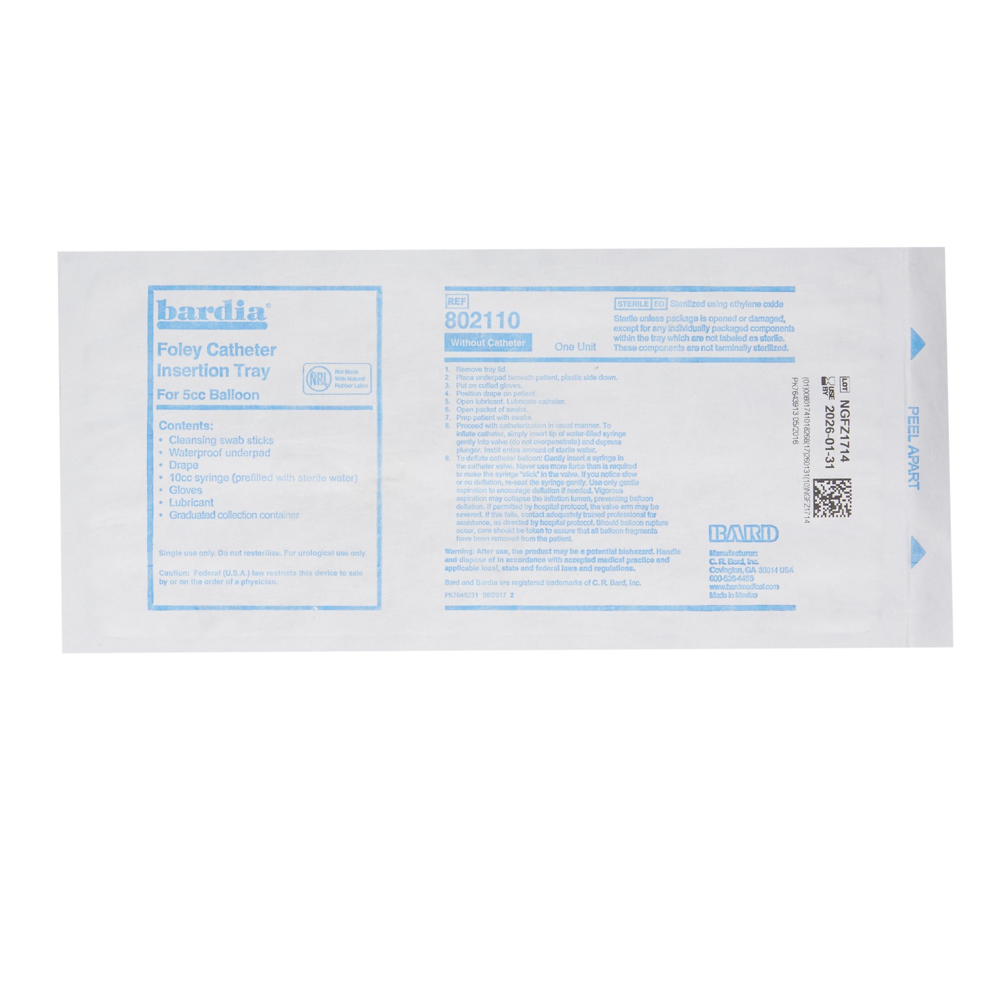 | Contents | Waterproof Underpad, 5 G Lubricating Jelly, 2 Latex Free Exam Glove, Graduated Peel-Top Tray, Bzk Swab, 10 CC Syringe |